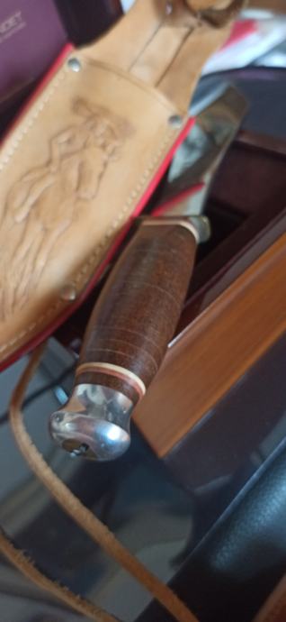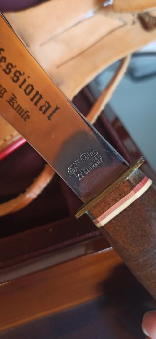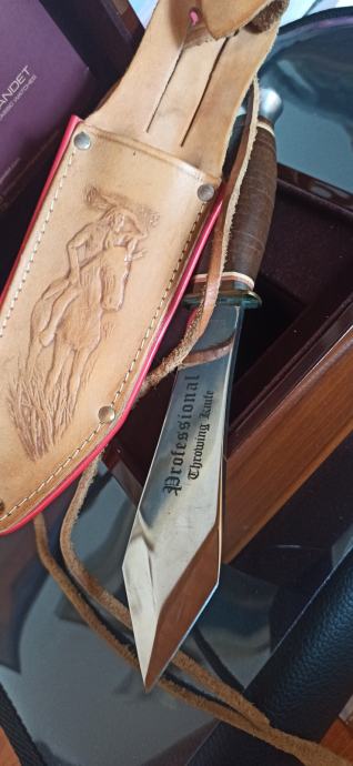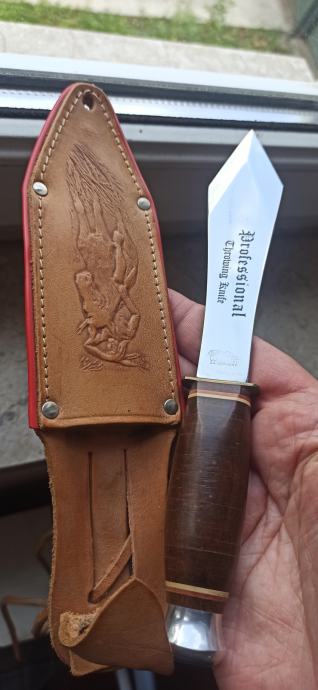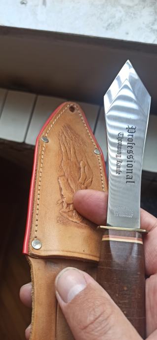 Njemački profesionalni nož za bacanje iz 90 tih kao nov s lijepom kožnom futrolom za nošenje preko pojasa.
