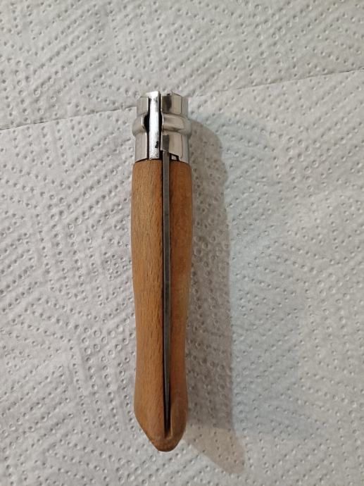 Prodaje se francuski džepni preklopni nožić marke OPINEL carbone No 9, ručne izrade. Vojna inačica. Poznati i prepoznatljivi francuski noževi. Oštrica noža je izrađena od ugljičnog čelika, drška od bukovog drveta sa metalnom kočnicim od inoxa koja fiksira nož u otvorenom i zatvorenom položaju. Dužina oštrice 9 cm. Stariji model bez loga na drškama koji se tada nije gravirao. Bez oštećenja, kao nov. Možda bi trebalo polirati oštricu kako bi bio u punom sjaju. (-1)