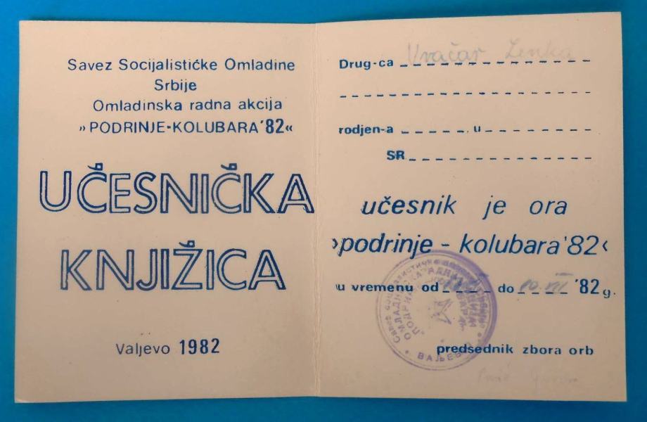Učesnička knjižica za sudionika Omladinske Radne Akcije '' PODRINJE-KOLUBARA 1982. '' ... glasi na ime Lenka Vračar iz Splita.
