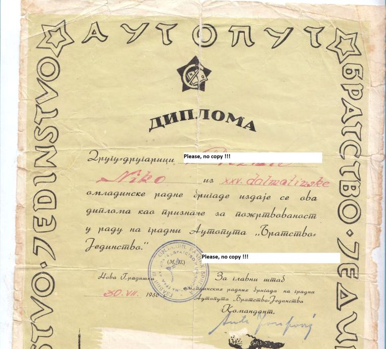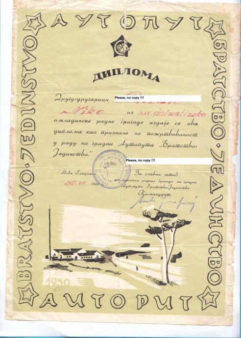 Stara originalna diploma dodjeljena stanovitom gospodinu NN kao priznanje za požrtvovnost u radu na izgradnji autoputa "Bratstvo i jedinstvo".