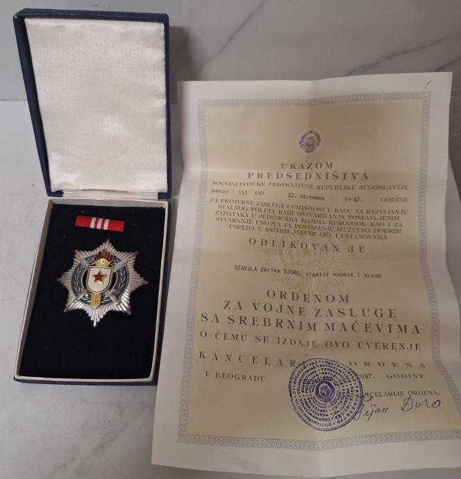 Orden za vojne zasluge sa srebrnim mačevima dodjeljivan je rukovodiocima jedinica oružanih snaga SFRJ koji svojim primjerom i umješnošću u radu razvijaju u jedinici kojom rukovode stalan polet radi ostvarivanja postavljenih zadataka, ili koji su u jedinici ili ustanovi stvorili uslove za postizanje izuzetno dobrih uspjeha, ili koji se odlikuju takvim starješinskim i vojničkim osobinama da služe za primjer drugima.