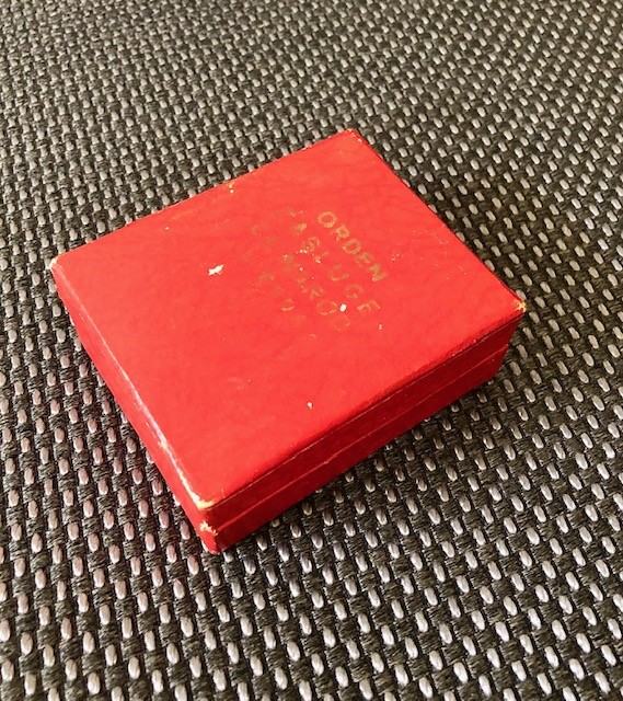Kutija je dim. 84 x 68 x 31 mm. Dvojbeno je da li je kutija izvorno pripadajuća ili je dodana kasnije radi kompletiranja ordena obzirom da su na poleđini kutije olovkom napisana dva broja ordena (27755 i 25799)