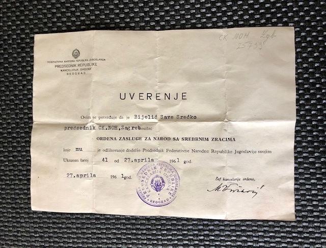 odličnom stanju dodijeljen 27.04.1961. god. g. Srećku Bijeliću, jugoslavenskom i hrvatskom političaru