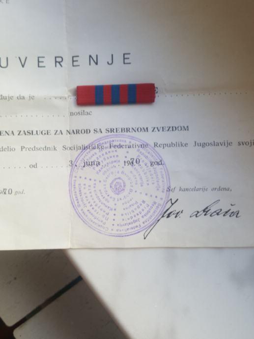 Orden zasluge za narod 3.reda srebrne zrake. sa pisanim uvjerenjem. potrgana puca -igla lošija kutija