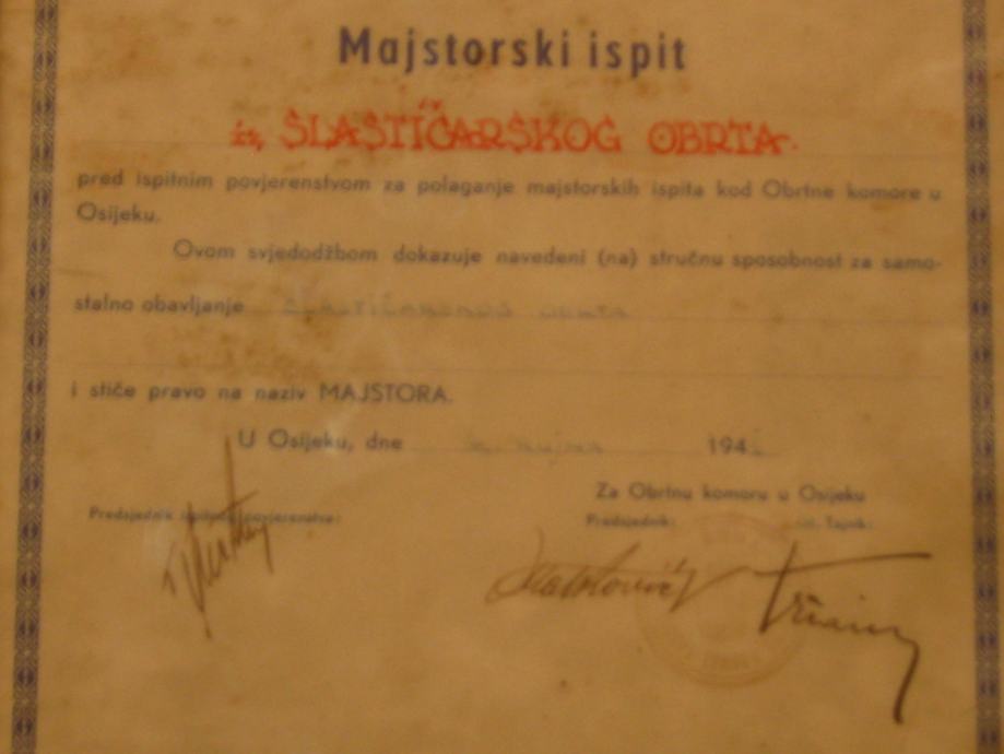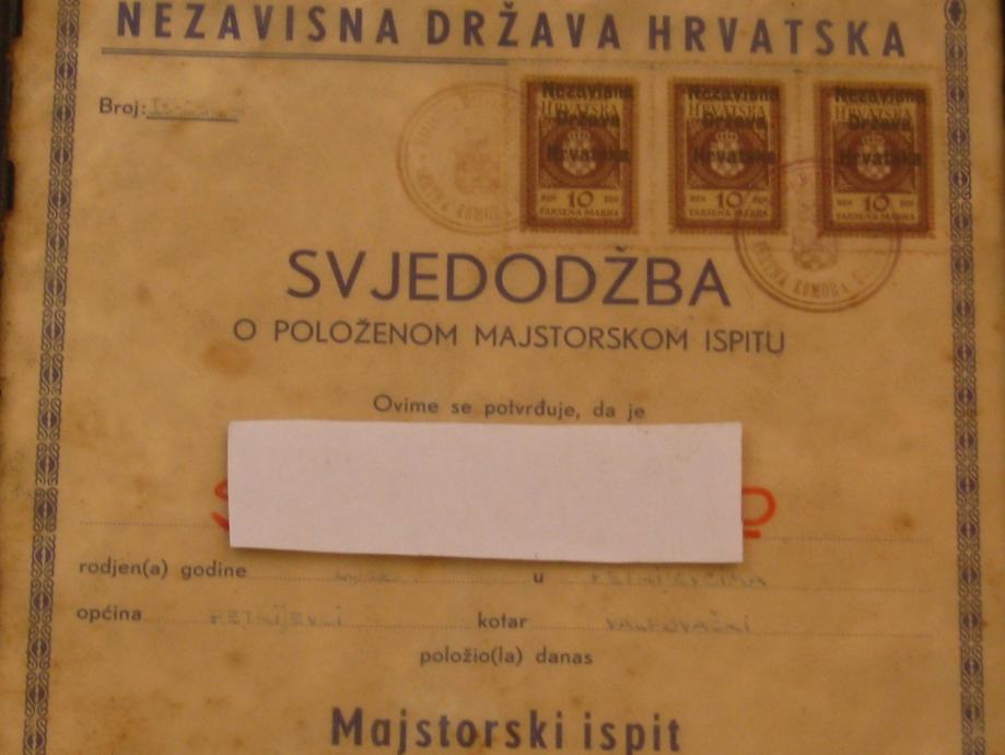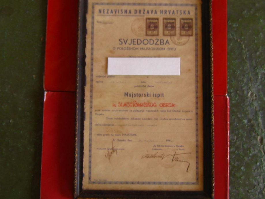ORIGINAL SVJEDODŽBA IZ PERIODA NDH O POLOŽENOM MAJSTORSKOM ISPITU U OBRTNOJ KOMORI OSIJEK iz 1941. godine---36x23 cm...