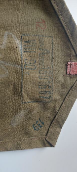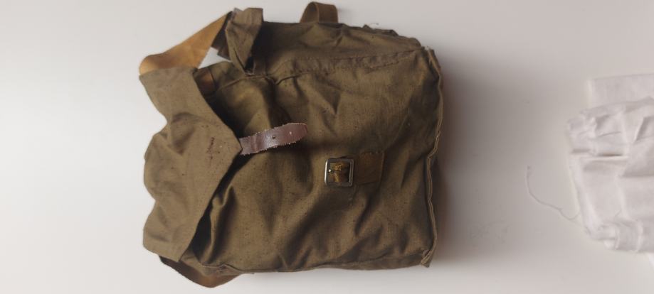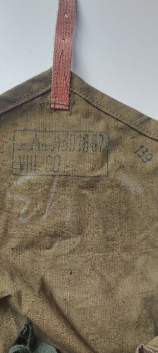 Torbica je jasno obilježena GOST pečatom, kontrolnim oznakama vojne tehničke kontrole (OTK), te oznakama mjeseca proizvodnje i šifre tvornice, što nedvojbeno potvrđuje autentičnost, vojno porijeklo i hladnoratovski period proizvodnje. Platno je originalno pamučno, bez naknadnih zahvata ili restauracije.