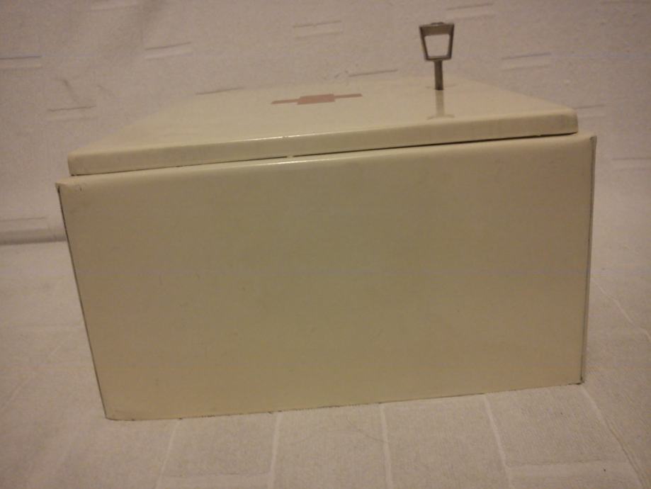 Ormarić prve pomoći, metalni, odlično očuvan, nikada nije bio na zidu, skoro kao nov, ima samo nekoliko rubnih nedostataka.