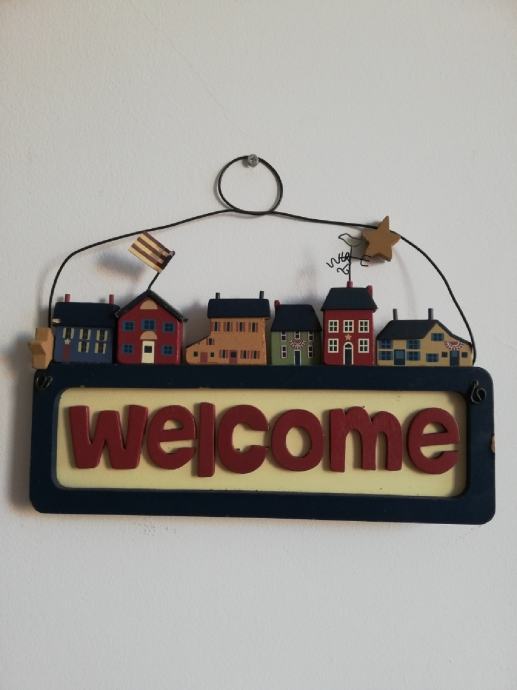 Dobrodošlica na drvenom postolju WELCOME.Dimenzije: 30,5 cm x 24 cm.