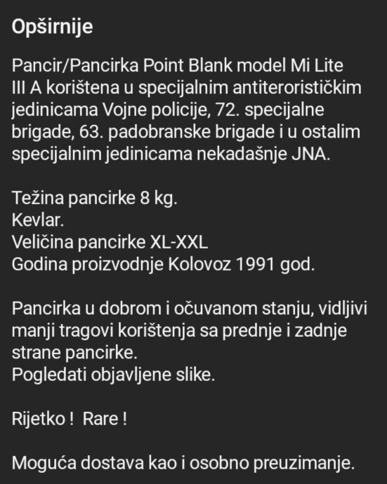 Pancir/Pancirka Point Blank model Mi Lite III A korištena u specijalnim antiterorističkim jedinicama Vojne policije, 72. specijalne brigade, 63. padobranske brigade i u ostalim specijalnim jedinicama nekadašnje JNA.