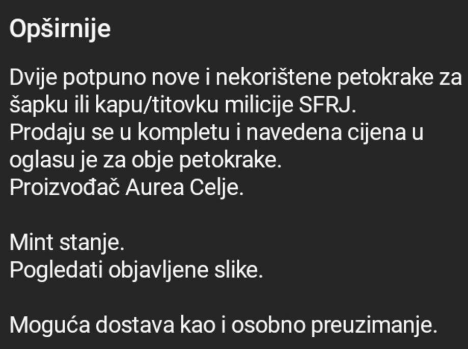 Dvije potpuno nove i nekorištene petokrake za šapku ili kapu/titovku milicije SFRJ.