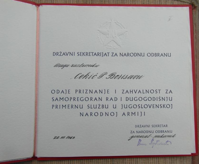 Plaketa za samopregoran rad i dugogodišnju primerenu službu u JNA
