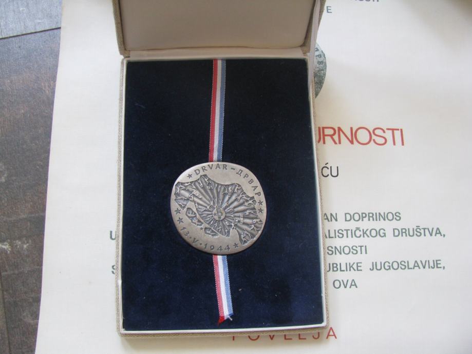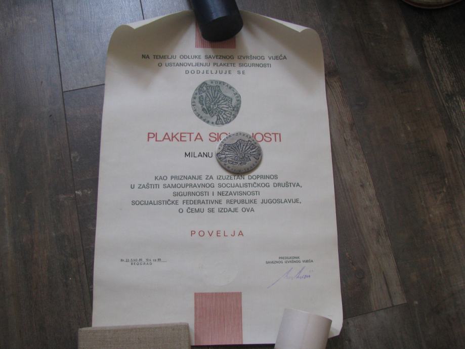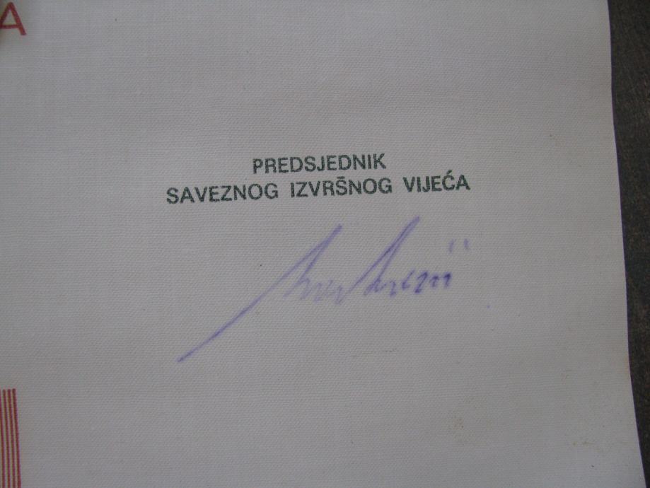 Plaketa sa poveljom, dodjeljena 1989 sa potpisom Ante Markovića.