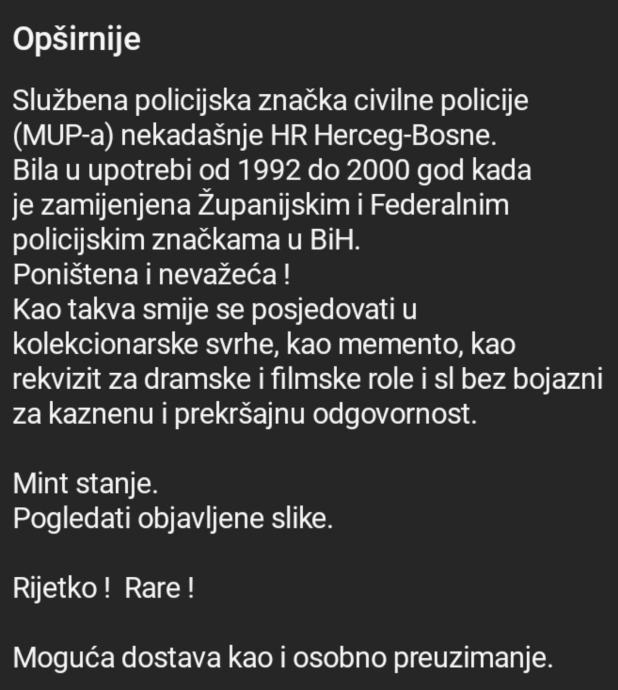 Službena policijska značka civilne policije (MUP-a) nekadašnje HR Herceg-Bosne.