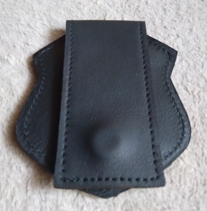 Značka je na kožnom holderu/nosaču koji se nosi na remenu hlača ili službenom opasaču.