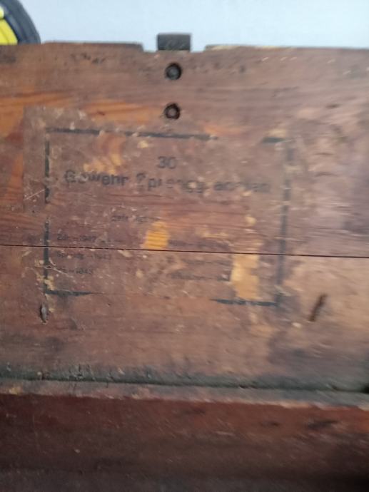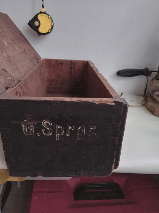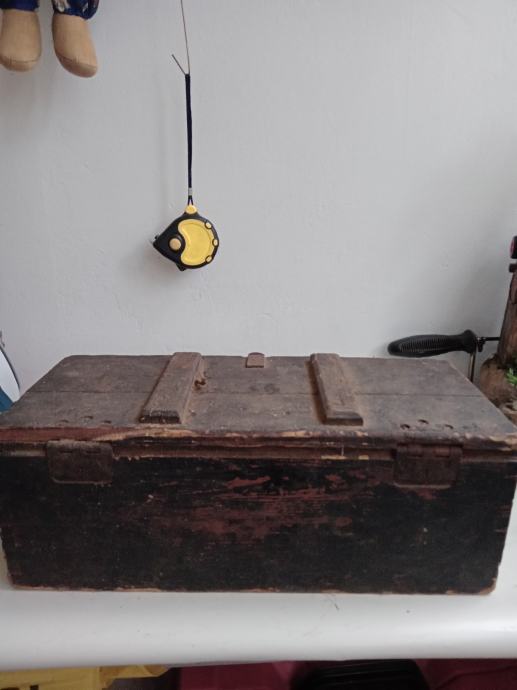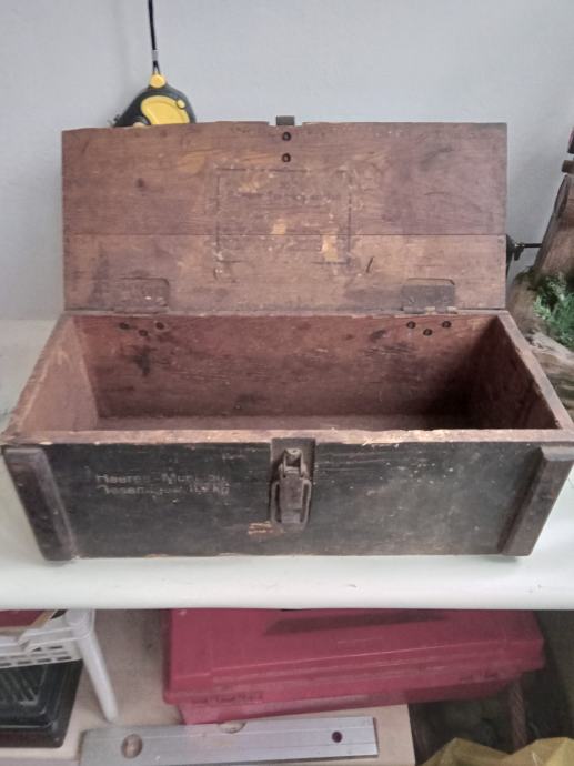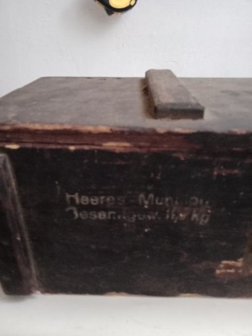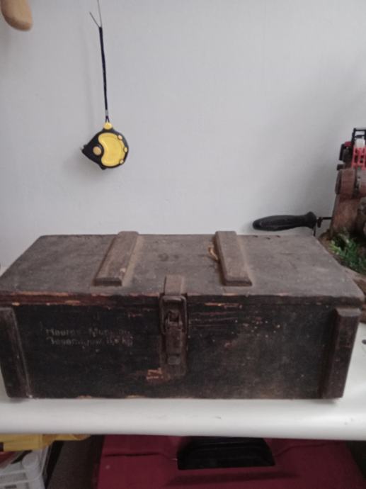 Vojni drveni sanduk iz 1943 Dimenzija Dužina 40 cm, Visina 15 ,Širina 18 cm Sanduk ima na sebi vidljive natpise s unutarnje i vanjske strane na njemačkom jeziku te godinu 1943.Na njemu su svi ispravni okovi i orginal boja.Sanduk je čitav I kopletan.