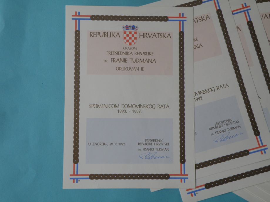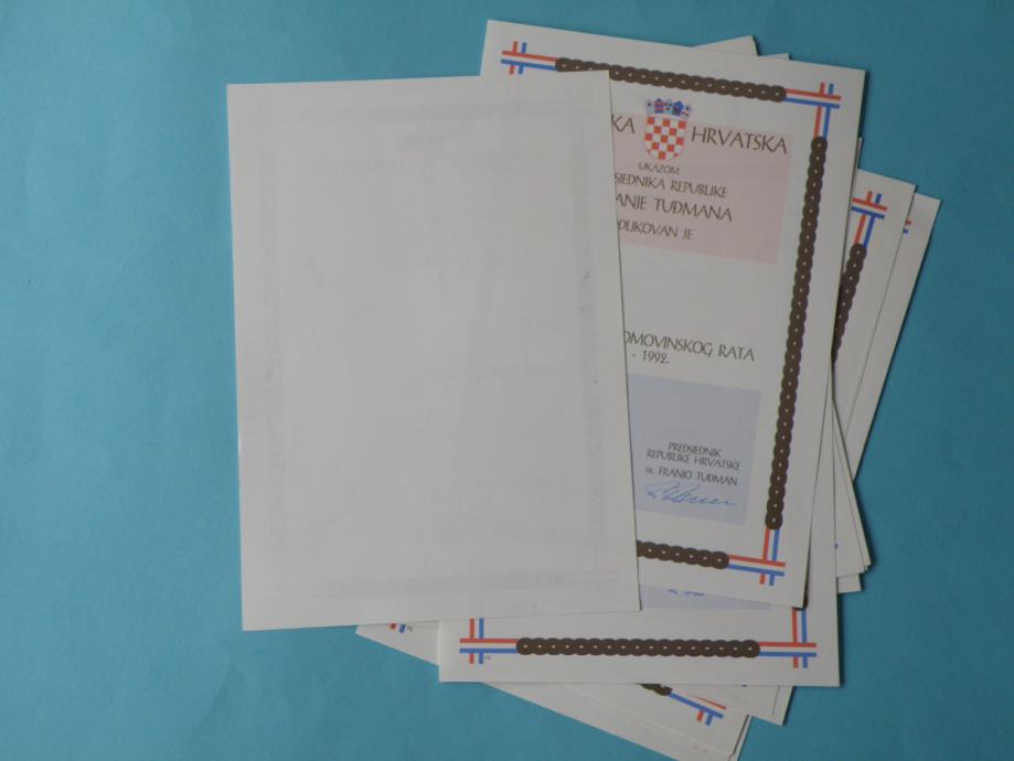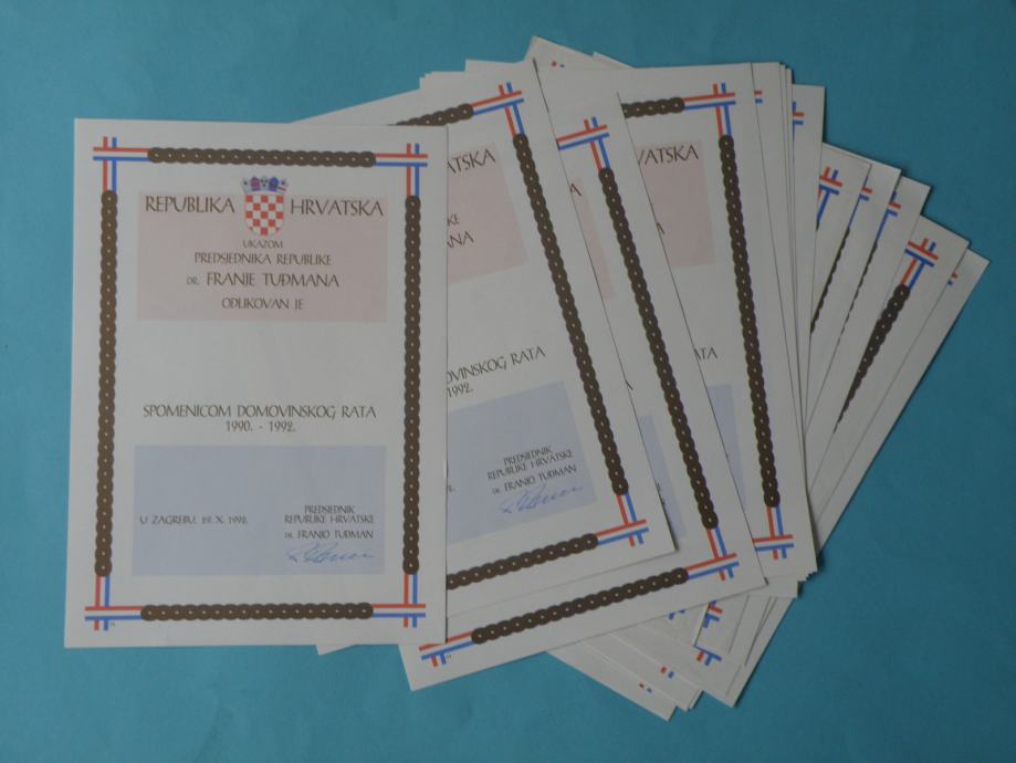REPUBLIKA HRVATSKA-LOT 15 KOM. DIPLOMA ZA SPOMENICU DOMOVINSKOG RATA 1990-1992., PRVI TIP