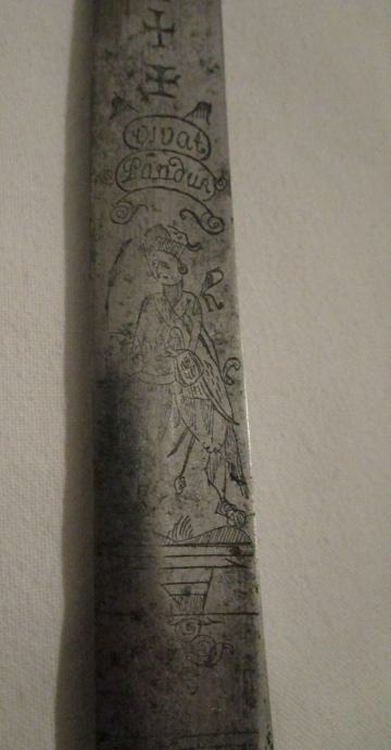 4) Mađarska, Pandur nož 1740/1745, oštrica s ugraviranim natpisom VIVAT PANDUR s obje strane i prikazom pandura. Nakon raspuštanja Trenckovih pandura 1745. godine, oštrice su se nastavile privatno koristiti u lovačkim noževima. 300 €.