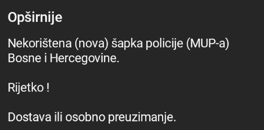 Nekorištena (nova) šapka policije (MUP-a) Bosne i Hercegovine.