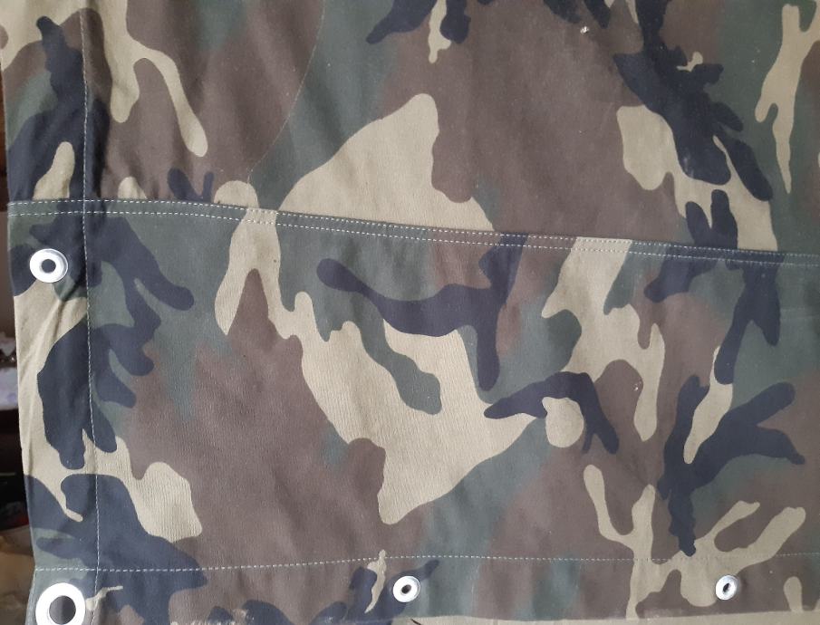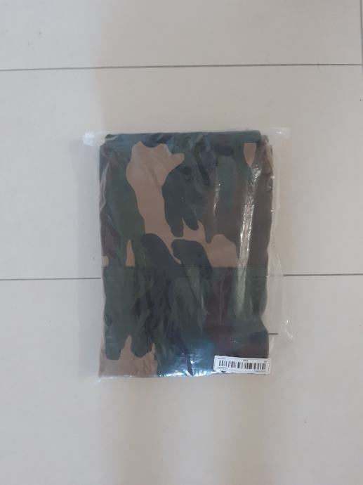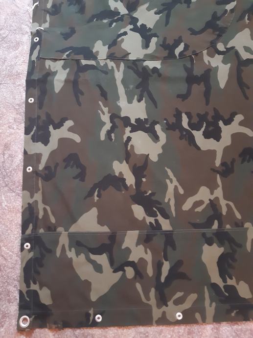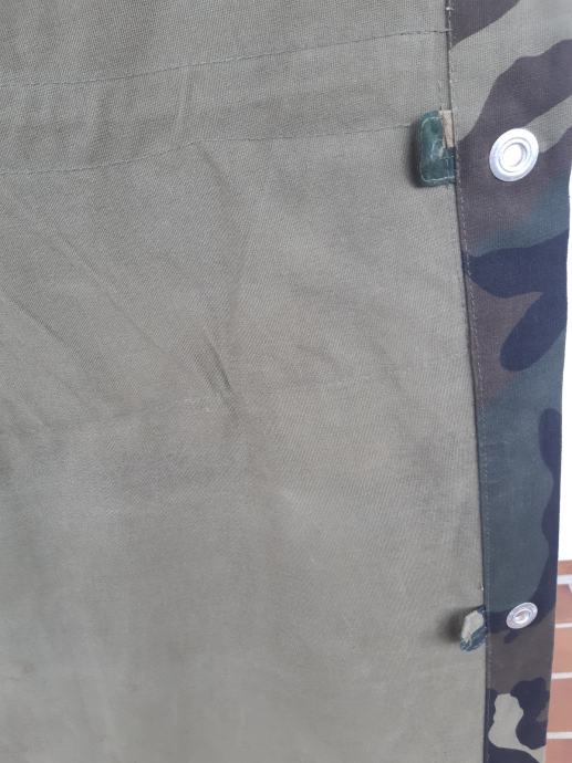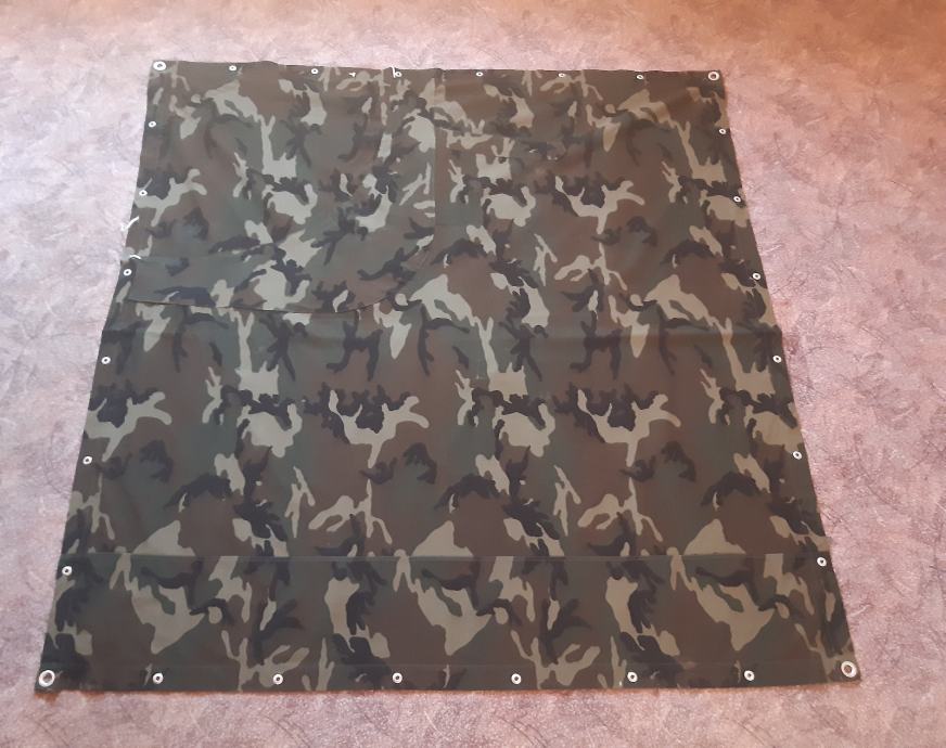 Šatorsko krilo HV sa konopčićem. NOVO. Kamuflaža woodland. Veličina 175 x 185 cm. Koristi se i kao kabanica za kišu. Uz šatorsko dobijete i konopčić koji se koristi za pravljenje šatora. Vidljivo na fotografijama. (-1)
