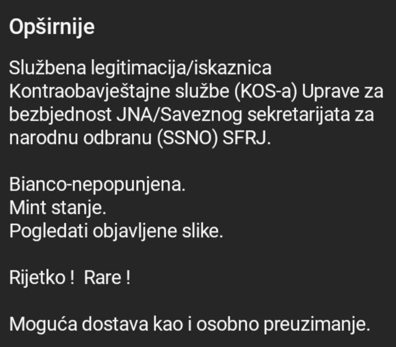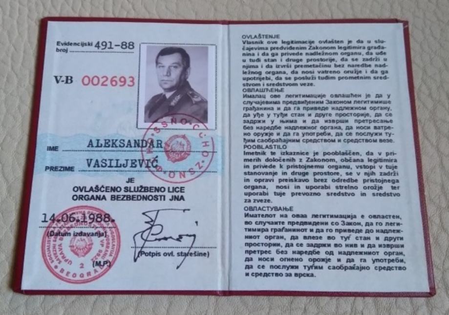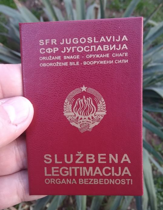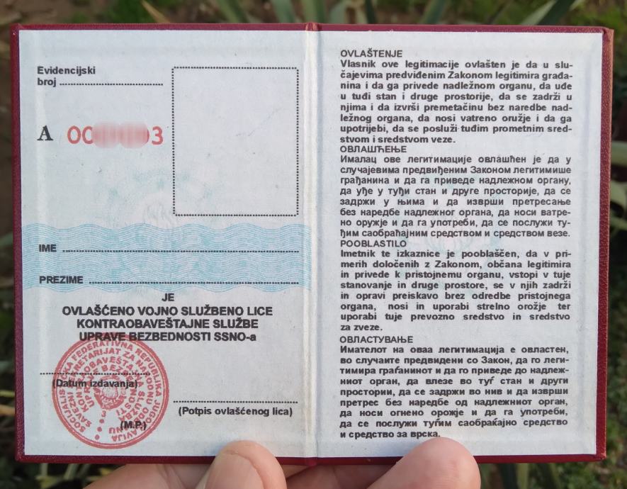 Službena legitimacija/iskaznica Kontraobavještajne službe (KOS-a) Uprave za bezbjednost JNA/Saveznog sekretarijata za narodnu odbranu (SSNO) SFRJ.