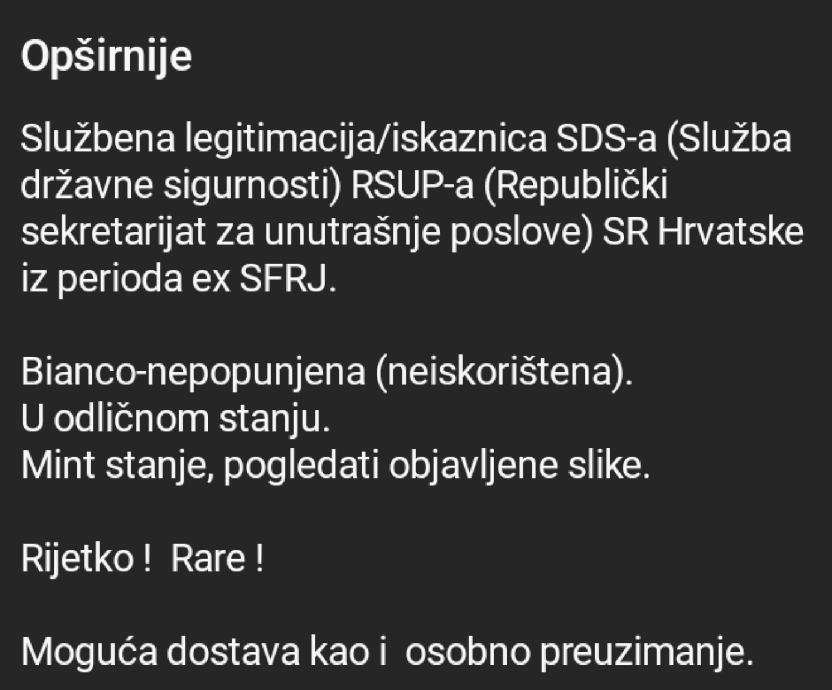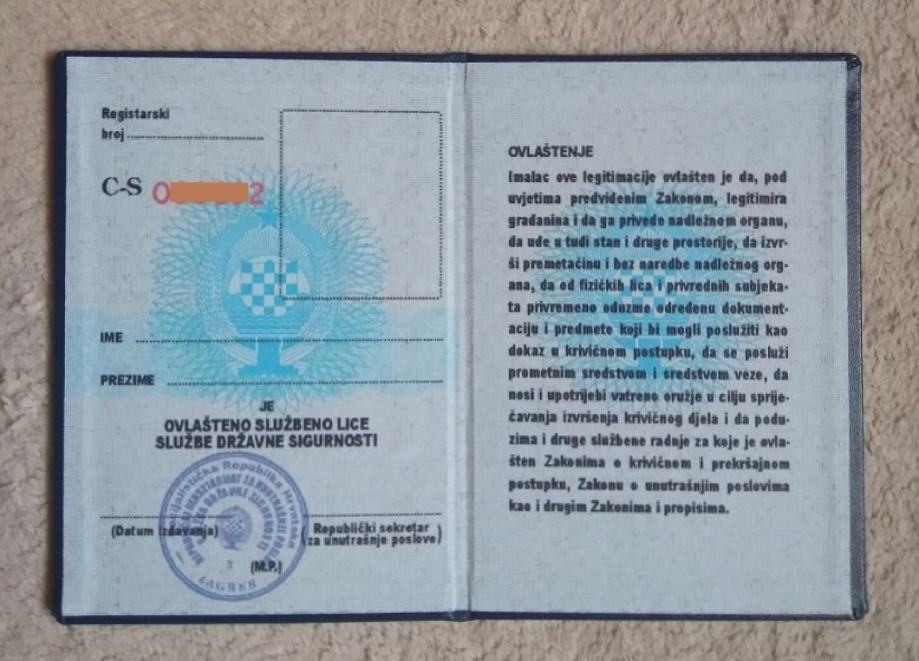 Službena legitimacija/iskaznica SDS-a (Služba državne sigurnosti) RSUP-a (Republički sekretarijat za unutrašnje poslove) SR Hrvatske iz perioda ex SFRJ.