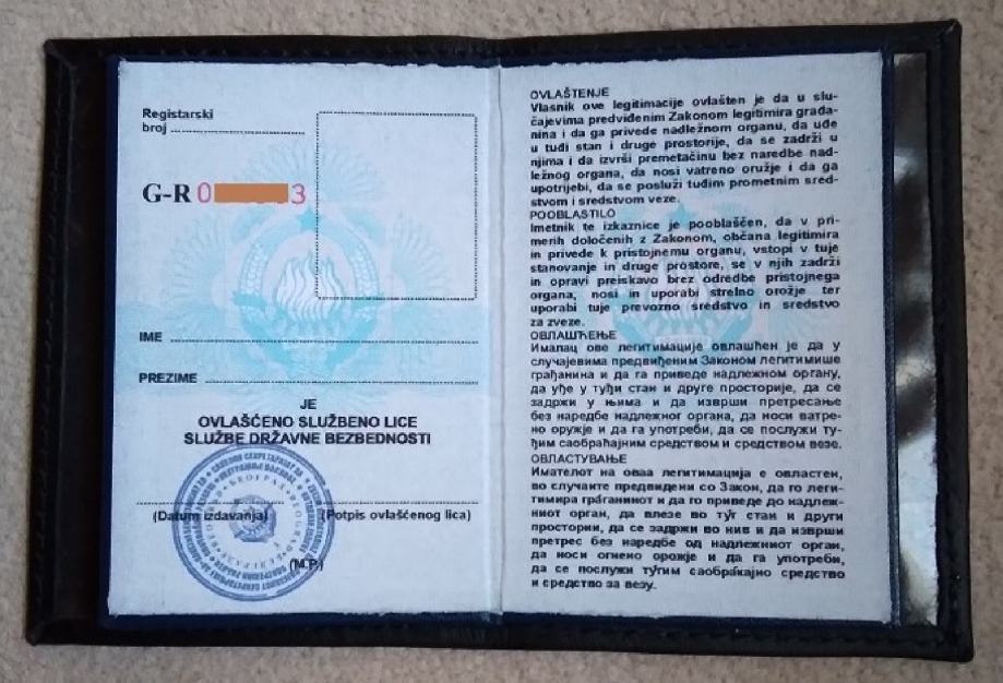 Službena legitimacija SDB-a (Služba državne bezbjednosti/sigurnosti) SSUP-a (Savezni sekretarijat za unutrašnje poslove) SFRJ.