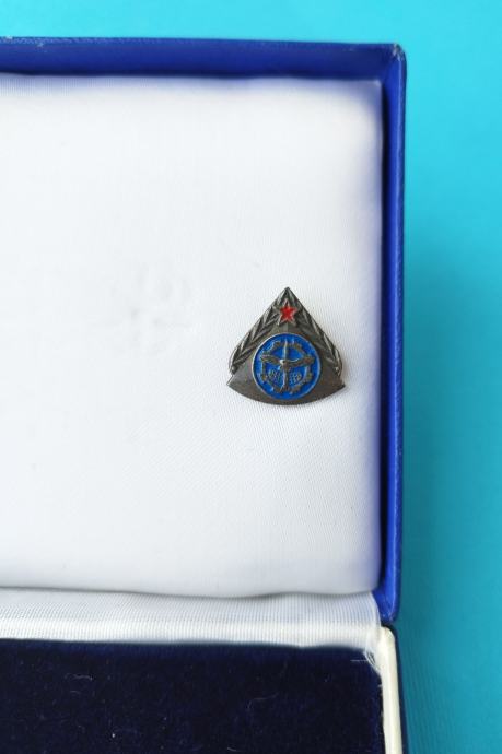Velika stara prsna emajlirana oznaka JNA Vojne škole PV i PVO Rajlovac u kutiji.