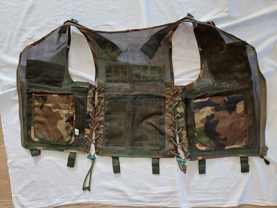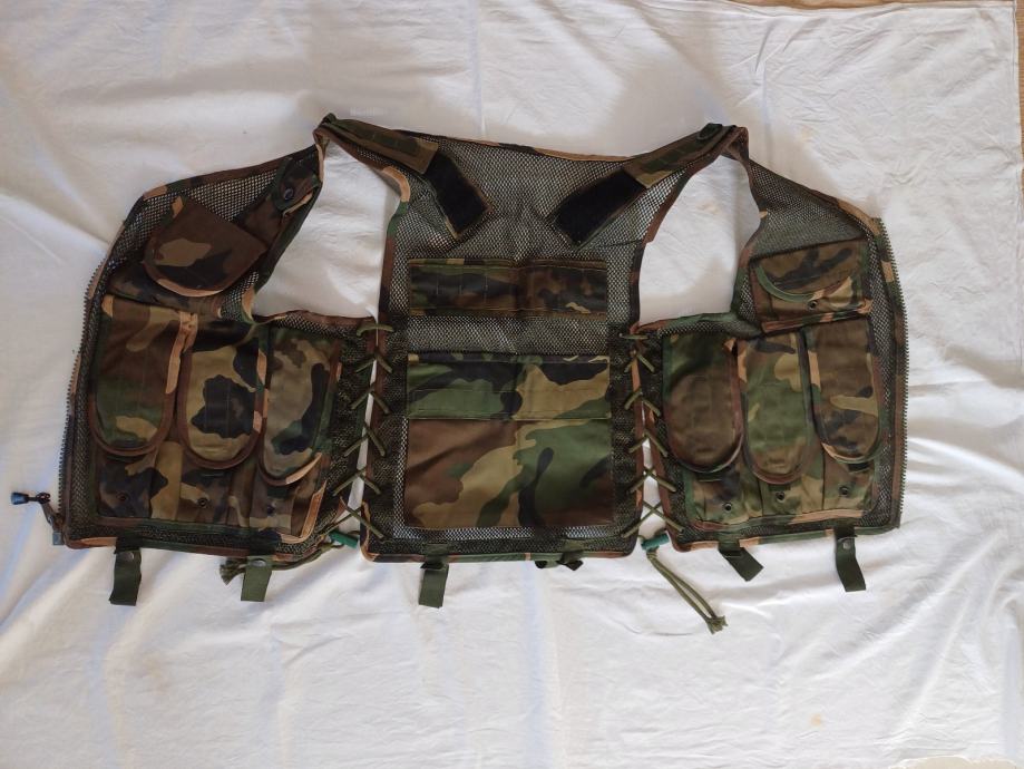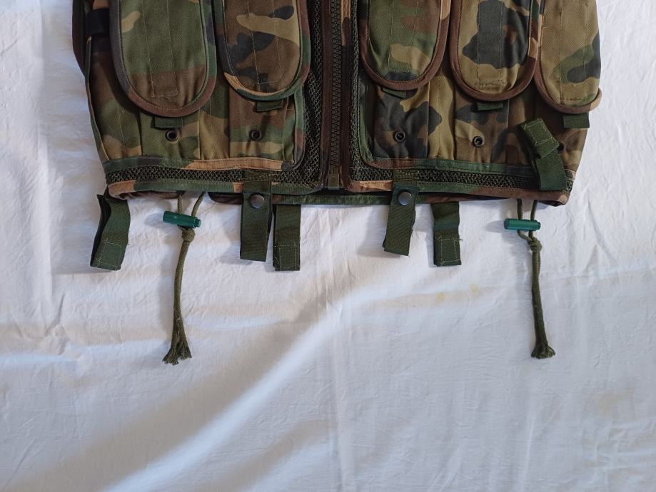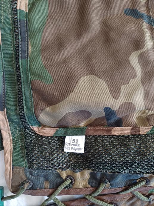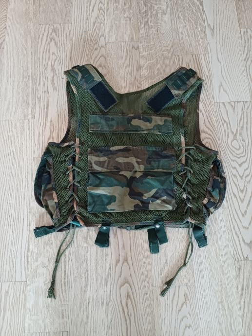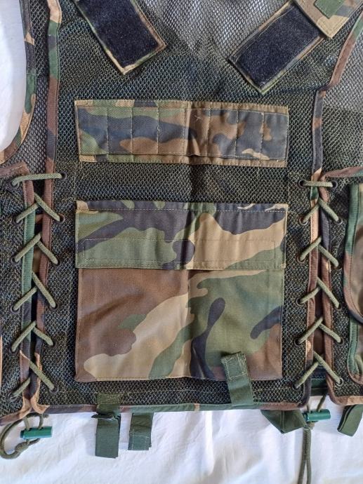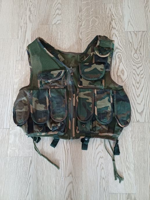 Taktički borbeni prsluk u woodland camouflage. Prsluk je super. Od HV. Domovinski rat. Malo korišten. Veličina L ili 52. Podesiv je pa odgovara veličinama 50 do 54. Model čvrst i nepoderiv zbog vrlo jake mrežice. Zbog bezbroj džepova vrlo je praktičan: dva unutarnja, šest okomitih za okvire, tri manja prsna džepa i jedan veliki na leđima. Pogledati foto obavezno.