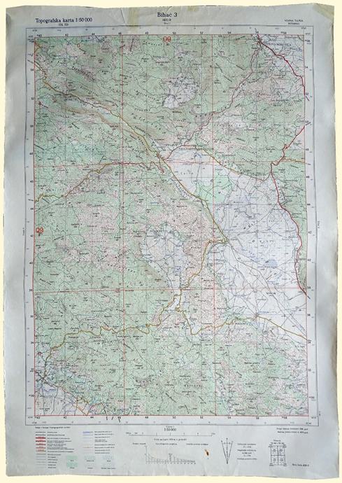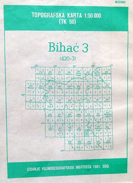 karta JNA, Bihać 3 (broj lista 420-3) pokriva Korenica i Krbavsko polje