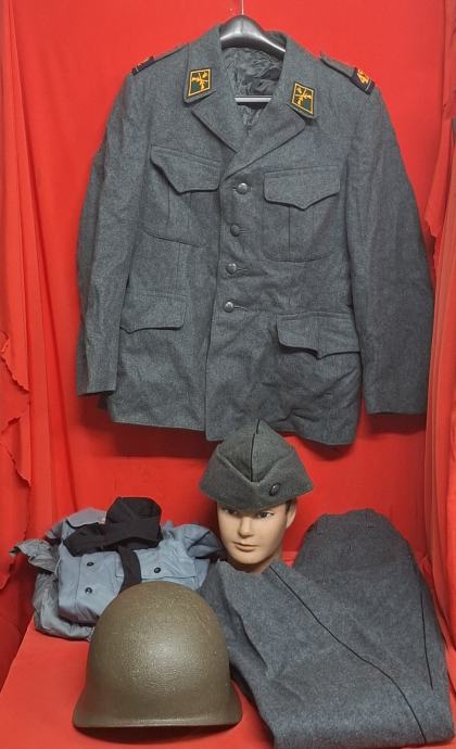 Stanje kao na slikama cjena za kommplet a za pojedinacno...dogovor.....sako...si jel...2 hlace...2 kosulje...kravata....kapa...sljem....oznake....i ruksak....kaciga prodana.....