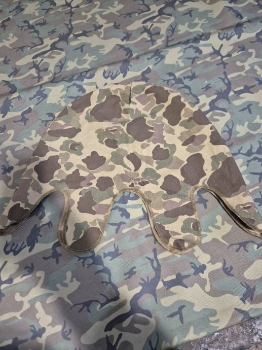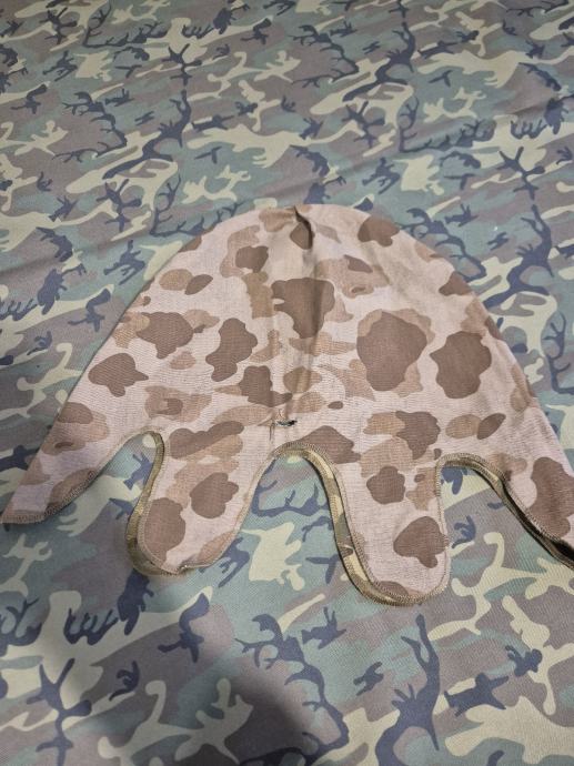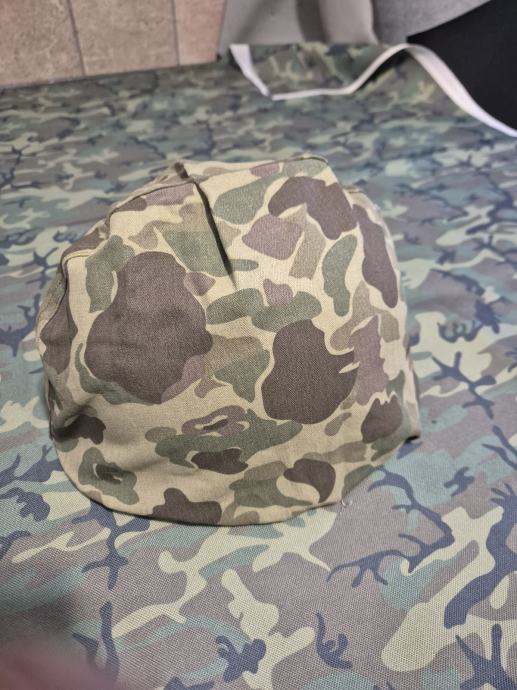 Frog skin camo navlaka za M1 kacigu, reprodukcija.stanje odlicno, bila je na sljemu kao ukras u polici.izrezane su rupice za provlacenje podbradnog remena