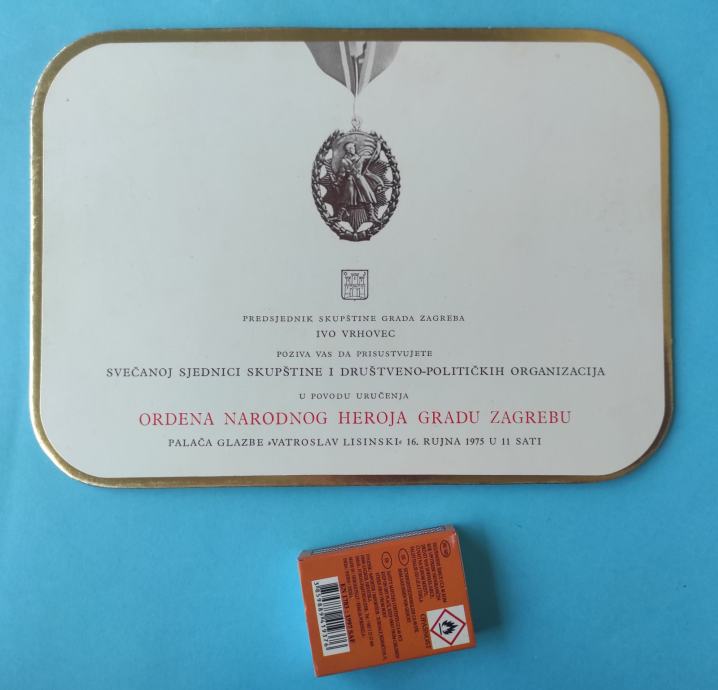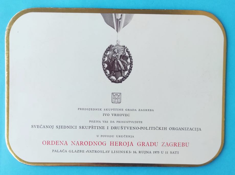 Prekrasna, velika, ultra kvalitetna pozivnica (kao nekakva plaketa) iz 1975. godine kojom predsjednik Skupštine grada Zagreba Ivo Vrhovec poziva na svečanu sjednicu prigodom uručenja Ordena narodnog heroja Gradu Zagrebu.