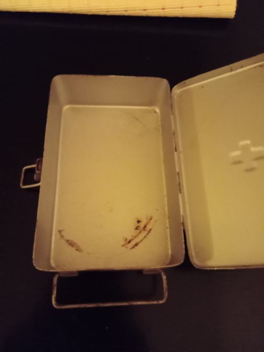 Prodajem metalnu. kutiju vojnu za prvu pomoć. Kutija je dobro ocuvana zatvara se bez problema.Cijena 20 eura