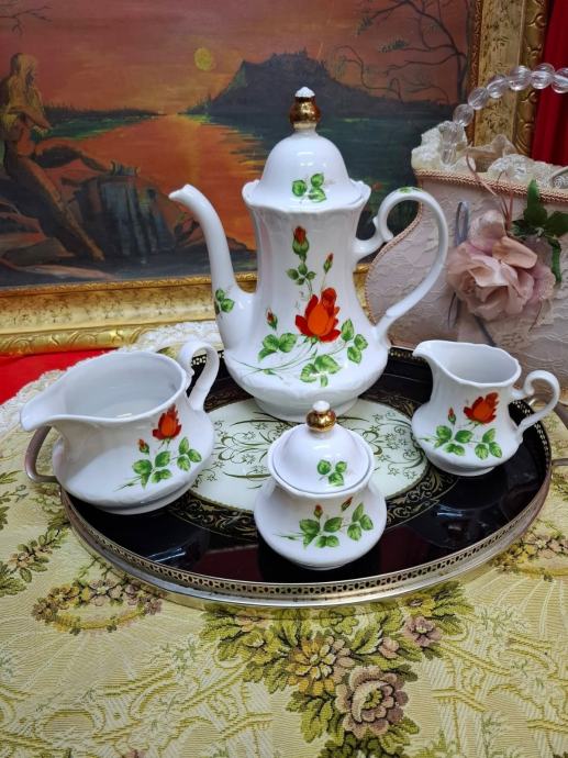 Predivan set za posluživanje čaja ili kave. Čajnik,posuda za šećer manja i veca posuda za mlijeko. Koristeno mozda jednom..