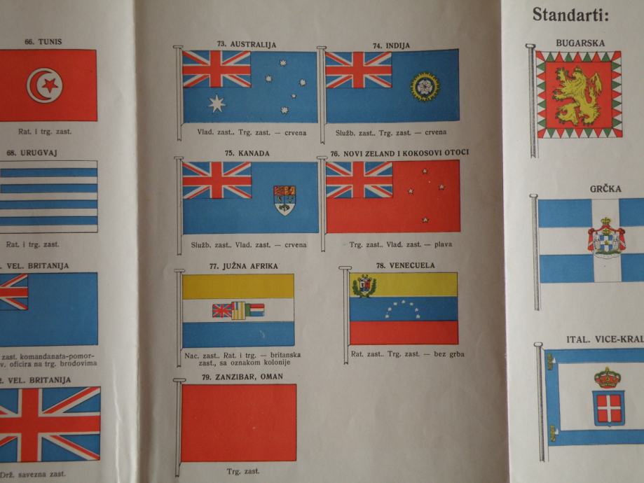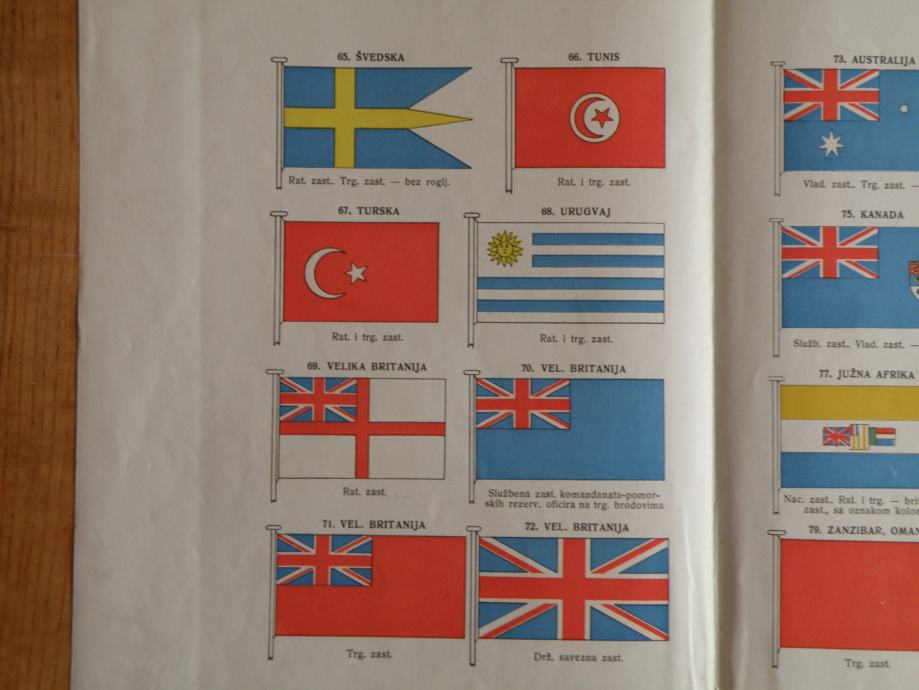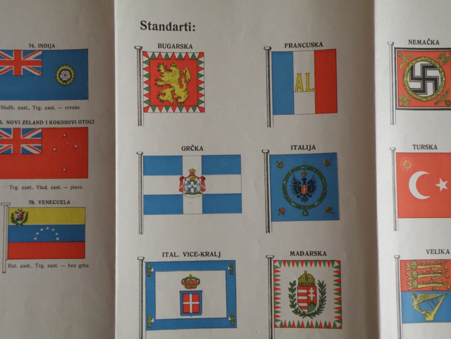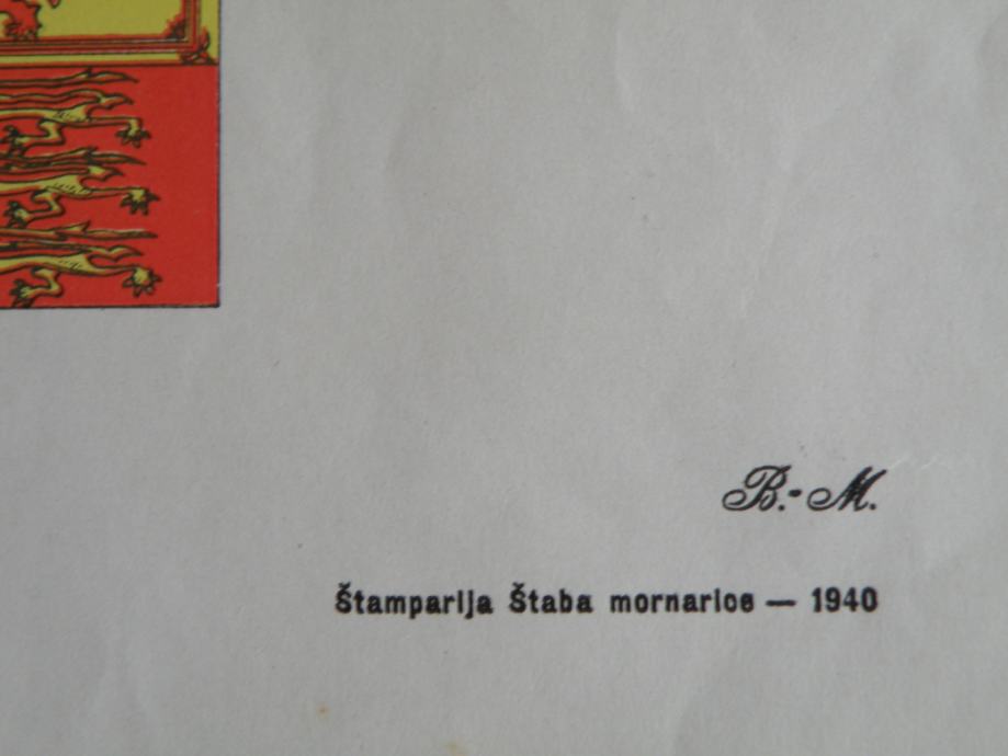Na ovom plakatu vidi se kako izgledaju Ratne Zastave koje na svojim Ratnim brodovima imaju neke od stranih država . Plakat ima u donjem desnom uglu odštampano , incijale autora dizajna ovih plakata : "B. M. ",..... "Štamparija Štaba mornarice 1940. Plakat je odlično očuvan.