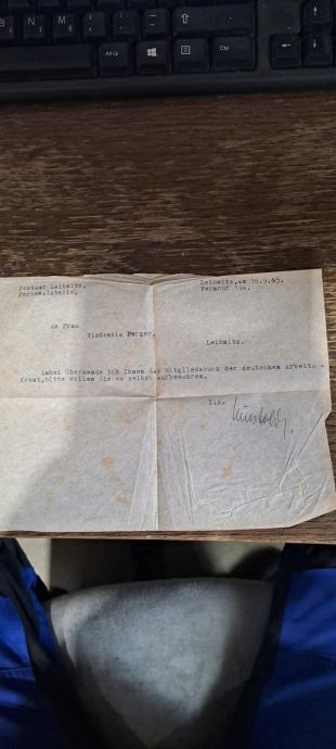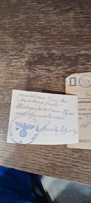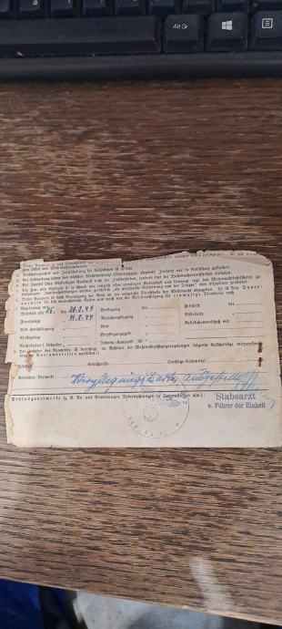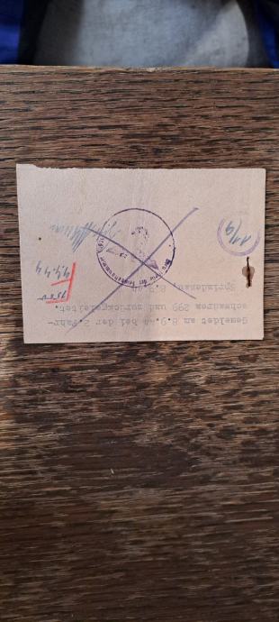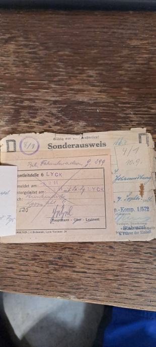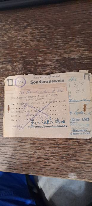 Radi se o njemačkom vojnom „Sonderausweis“-u (specijalnoj propusnici) iz 1944. godine, izdatom od Kreiskommandantur Lyck (Istočna Pruska), uz prateći kontrolni karton sa pečatom (Wehrmacht orao) i poslijeratno pismo iz 1945.