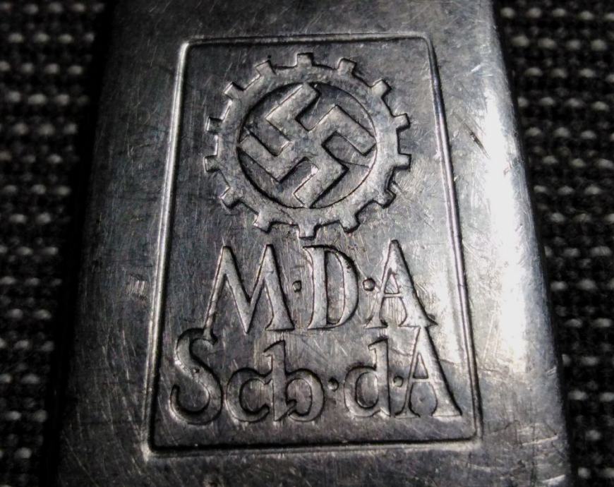 Vilica Njemačke radničke fronte (DAF) iz Drugog svjetskog rata s utisnutim logotipom zupčanika i svastike te natpisima "M•D•A" i "Scb•d•a".