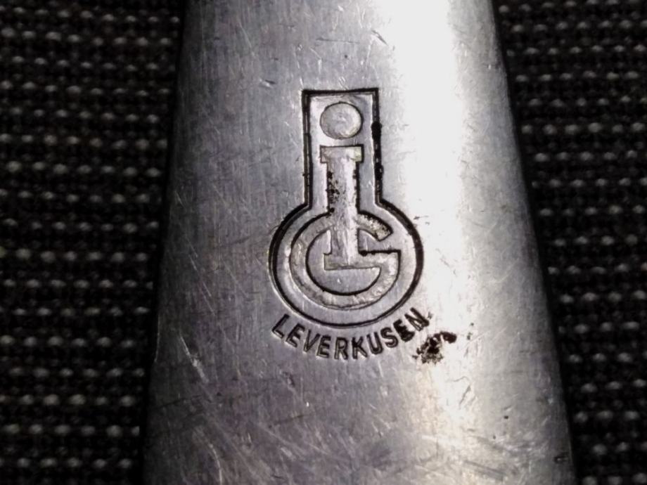 Sa prednje strane logotip I.G. Farben, Njemački kemijski konglomerat koji je djelovao od 1925. do nakon Drugog svjetskog rata. Puno ime tvrtke bilo je Interessen-Gemeinschaft Farbenindustrie AG.