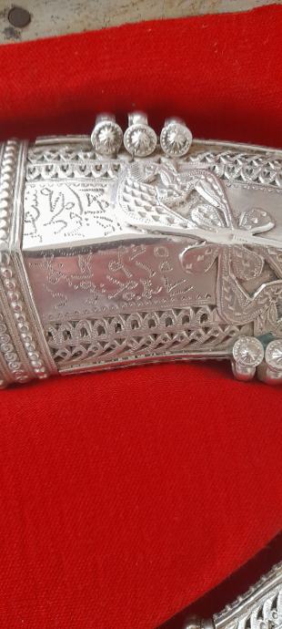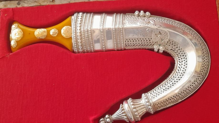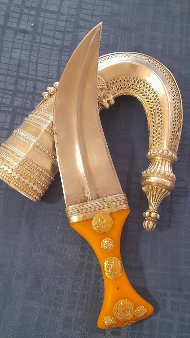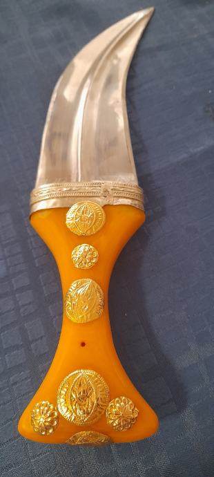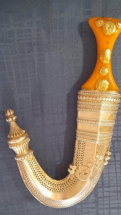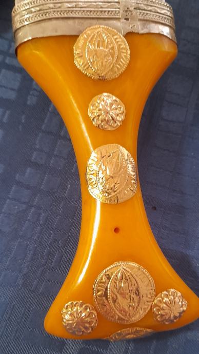 Jantarna drška sa zlatnim gumbima i srebrnim tokom.