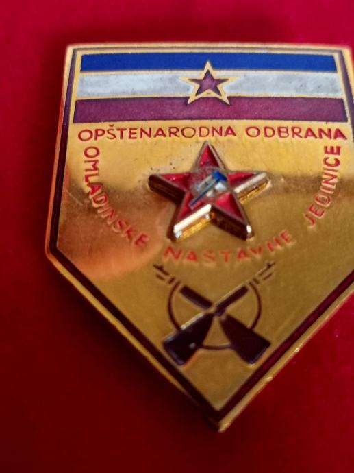 Značka za posebne zasluge u obuci omladine za stjecanje vojnih znanja i vještina. U originalnoj kutiji, veličina značke 4,4x3 cm.