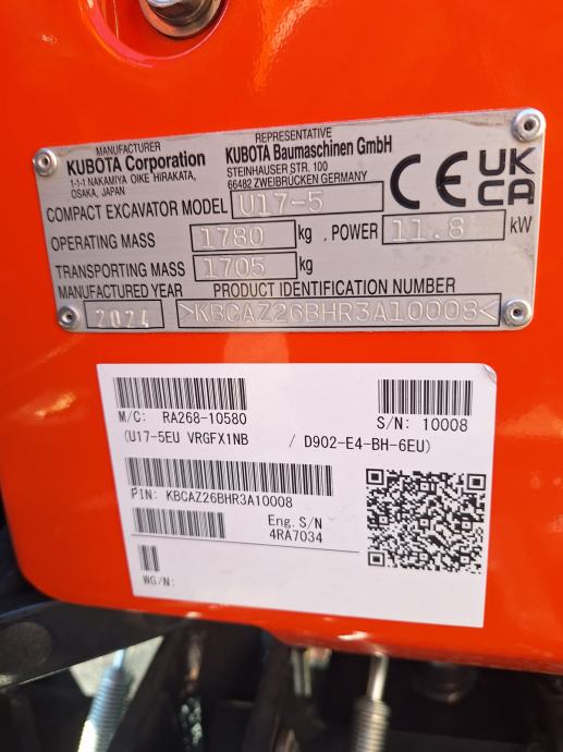Prodam novi bager Kubota U17-5, g. 2024 ima Kubota motor, širjenje gusjenica, dvije brzini, automatski gas, svi ključevi, dokumenti,