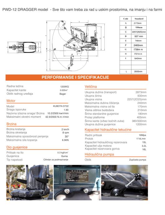 PWD12 je napredni model iz serije Play Work DRAGGER, stvoren za korisnike koji traže veću radnu dubinu, još robusniju konstrukciju i snažniji motor. Uz sve odlike ozbiljnog stroja posjeduje i širenje gusjenica. Podržava sve hidraulične priključke – te nudi više kontrole i snage na zahtjevnijim terenima. Dolazi s Koop ili Kubota motorom.