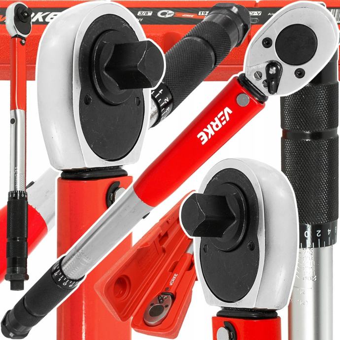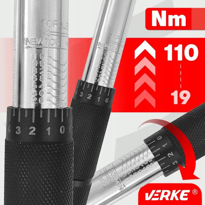 Moment ključ 3/8" 19-110 Nm. Izrađen od punog krom-vanadij čelika, ključ jamči visoku izdržljivost. Moment ključ je precizan alat za mjerenje momenta. Ključ se sastoji od glave s četvrtastim drškom i kraka za prijenos sile. Glava se koristi za pričvršćivanje šesterokutnih nasadnih ključeva.