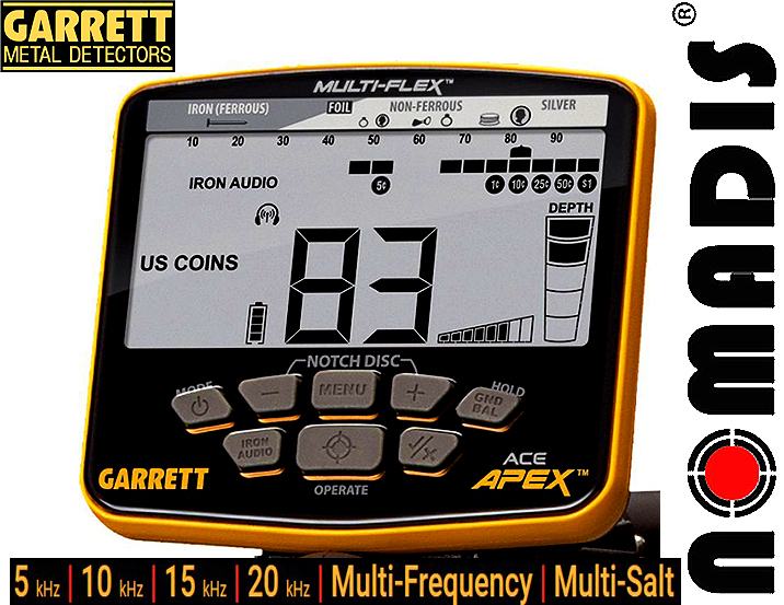Garrettova Multi-Flex tehnologija, koju pokreće vrhunska širokopojasna digitalna platforma, jednostavno vam pruža više svestranosti s Apexom nego što je možete pronaći na bilo kojem drugom detektoru u njegovom cjenovnom rangu! Odaberite jednu od snažnih pojedinačnih frekvencija za poboljšanje otkrivanja određenih nalaza * ili odaberite jedan od simultanih višefrekventnih načina rada Apexa, kako biste postigli izvrsno otkrivanje svih nalaza na svim terenima. U istodobnom Multi-Flex radu, rad s detektorom je poput korištenja četiri različita jednofrekventna detektora istovremeno.