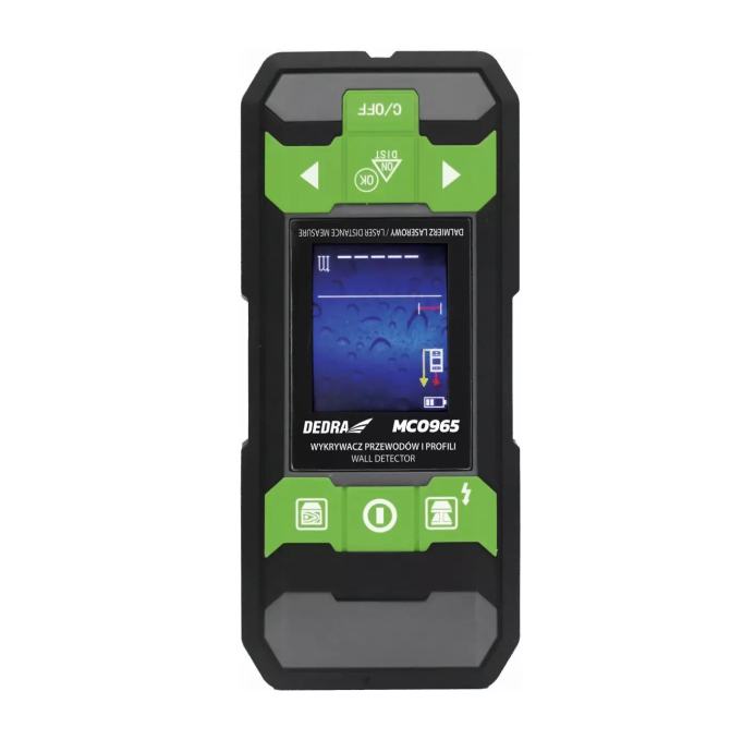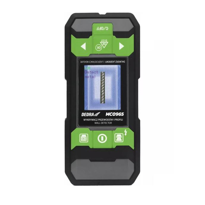Detektor kabela koristan je alat i za hobiste i profesionalce. Posebno će ga cijeniti oni koji trebaju izvršiti adaptacije, a ne poznaju raspored žica, hidrauličnih cijevi ili profila u zidovima. Korištenjem detektora žica i profila ubrzavate svoj rad, a ujedno brinete o svojoj sigurnosti, jer bušenje kroz npr. žica pod naponom nije samo oštećenje električnog sustava, već i visok rizik od strujnog udara i gubitka zdravlja ili života. Detektor kabela i profila DEDRA MC0965 omogućuje detekciju metalnih elemenata i profila, električnih vodova bez i sa izmjeničnim naponom i drva, kao i drugih objekata kao što su željezo, beton, staklo, aluminij itd. Osim toga, detektor je opremljen funkcijom daljinomjera s radnim rasponom od 0,05-40 m, što je velika pogodnost, jer umjesto dva uređaja imamo jedan. U kompletu s uređajem pronaći ćete torbicu za remen, uže, USB-C kabel, upute za upotrebu. Značajke uređaja za detekciju žica i profila MC0965: Šareni, s pozadinskim osvjetljenjem i lako čitljiv zaslon od 1,8" Zvučni signal kada se otkrije traženi materijal Automatsko isključivanje nakon 5 minuta neaktivnosti Glasovna funkcija na engleskom engleskom jeziku s mogućnošću onemogućavanja Detekcija profila, cijevi i žica sa i bez izmjeničnog napona Gumirani elementi kućišta poboljšavaju prianjanje Napajanje: 3.7V baterija sa mikro USB priključkom Zaslon: LED diode od 1,8". Radna temperatura: 0°C - 40°C Temperature skladištenja: -20°C - 60°C Zaslon s pozadinskim osvjetljenjem: da Zvučni alarm: da Tehnički podaci detektora profila MC0965: Vrsta detektiranih objekata: drvo/metal/feromagnetski metal/žice pod izmjeničnim naponom max. dubina detekcije drvenih profila: 20 mm (precizno) / 38 mm (grubo) max. dubina detekcije AC žica pod naponom: 40 mm max. dubina detekcije obojenih metala, npr. bakrene cijevi: 80mm max. dubina detekcije feromagnetskih metala: 100 mm Tehnički podaci daljinomjera MC0965: Radni raspon: 0,05-40m Točnost mjerenja: +/- 5mm Valna duljina: 635nm Snaga uređaja: ≤1mW Mjerne jedinice: mm/in/ft Memorija mjerenja: 30 jedinica Klasa lasera: II (crveni) Dvije referentne točke mjerenja: čelo/podnožje Postotni pokazatelji Šest funkcija površinsko mjerenje kontinuirano mjerenje mjerenje volumena trigonometrijske funkcije zbrajanje/oduzimanje minimalno/maksimalno