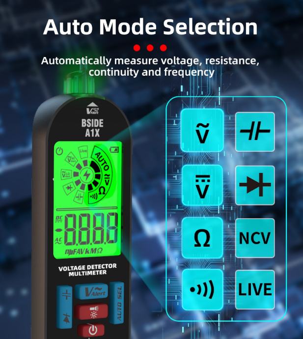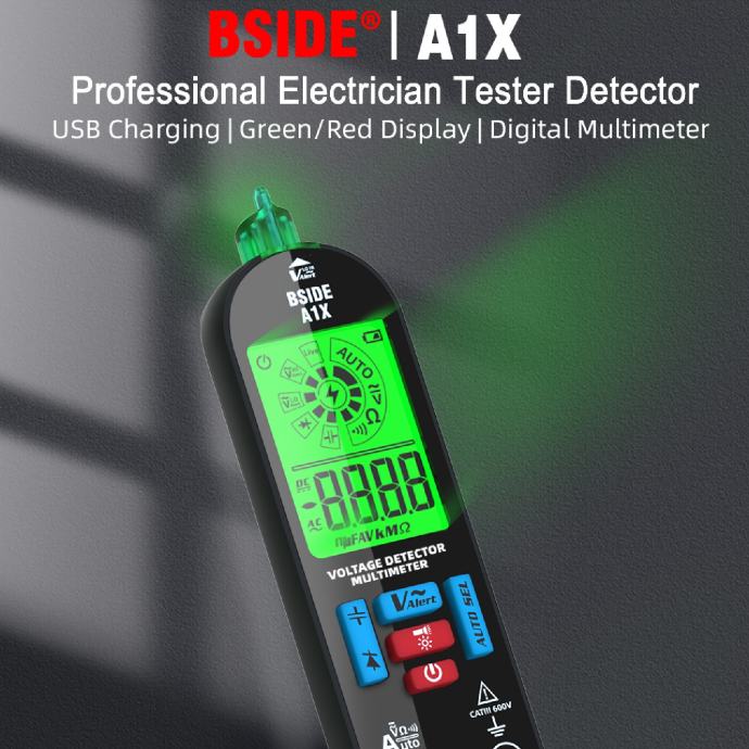 Detektor električnog napona i mjerni instrument marke BSIDE model A1X sa torbicom, digitalni multimetar sa integriranom punjivom baterijom, Voltmetar, NCV frekvencija, Ohm metar, test dioda, kapaciteta, Bezkontaktni detektor električnog napona, indikator, tester žive žice, faze, detekcija mjesta prekida žice.