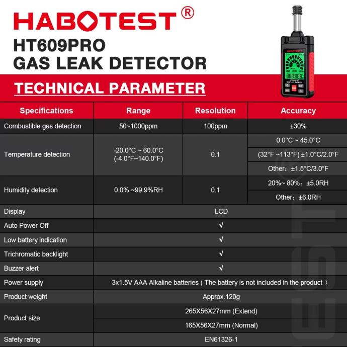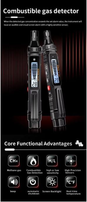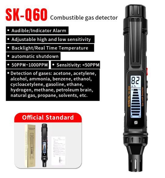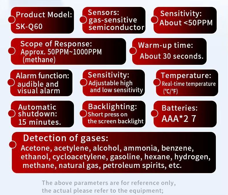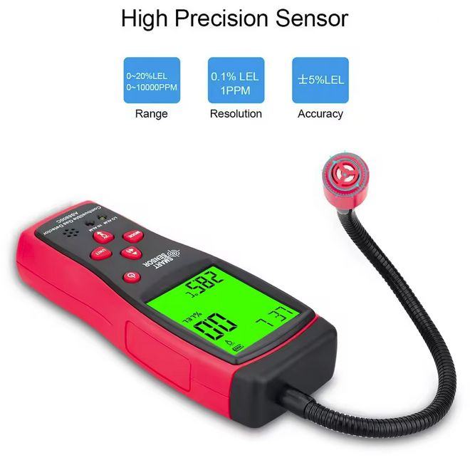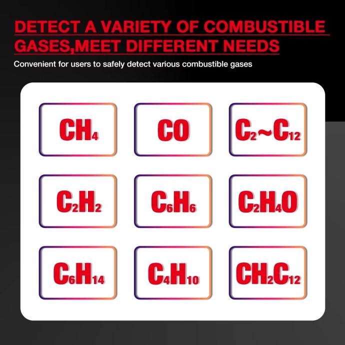 Test Gas (part list): Acetylene, alcohol, ammonia, benzene, butane, ethanol, oxirane, gasoline, hexane, hydrogen, methane, naphtha, natural gas, paint thinners, propane, solvents, etc.
