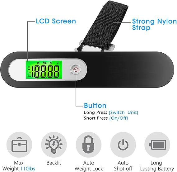 Njegov mali, prijenosni dizajn pruža veliku izdržljivost kako bi izdržao veliku težinu vaših putovanja. Ponesite ga u svoje pustolovine ili ga pohranite bez gnjavaže oko dodatne količine. Rukohvat visoke čvrstoće lako je rukovati dok ste u pokretu s metalnom kukom za teške uvjete rada i najlonskom trakom za čvrsto i sigurno držanje vaše prtljage. Značajke vage i funkcija automatskog isključivanja nakon neaktivnosti od 60 sekundi za očuvanje vremena i energije.