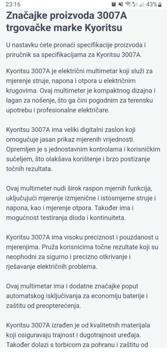 Povoljno prodajem Kyoritsu 3007A električni multimetar koji služi za mjerenje struje, napona i otpora u električnim krugovima. Ovaj multimeter je kompaktnog dizajna i lagan za nošenje, što ga čini pogodnim za terensku upotrebu i profesionalne električare