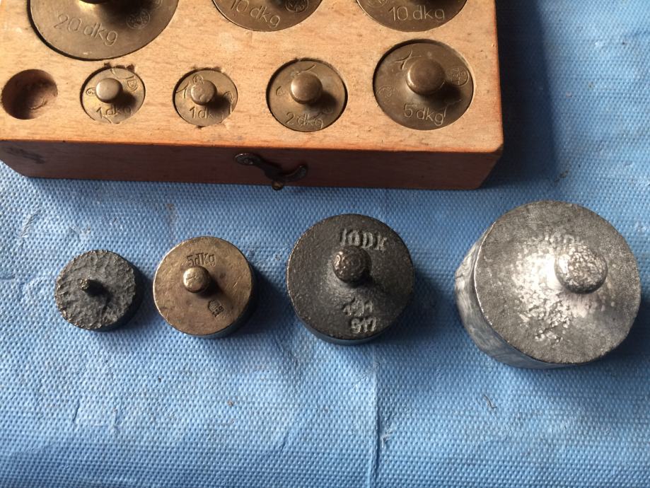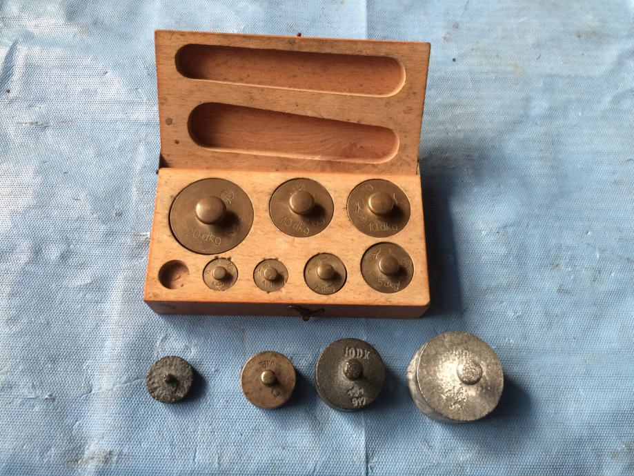 Set sastoji se od 7 mjedenih utega (jedan se zagubio) i to :